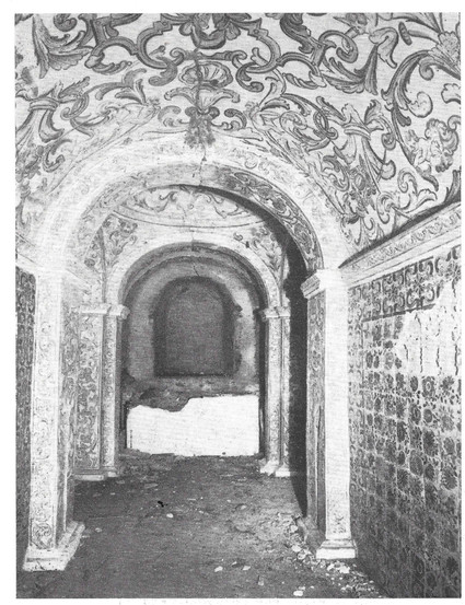 Esquerda: Parte do revestimento azulejar original no transepto, com azulejos azuis e brancos, do tipo de figura avulsa, do final do século XVII. Direita: Tabela ovoide, de mascarões, volutas, vieiras e a legenda latina encomiástica presa por dois serafins, situada no eixo da abóbada - Pintura a fresco do século XVII, afetada por uma fissura que percorre toda a abóbada.
